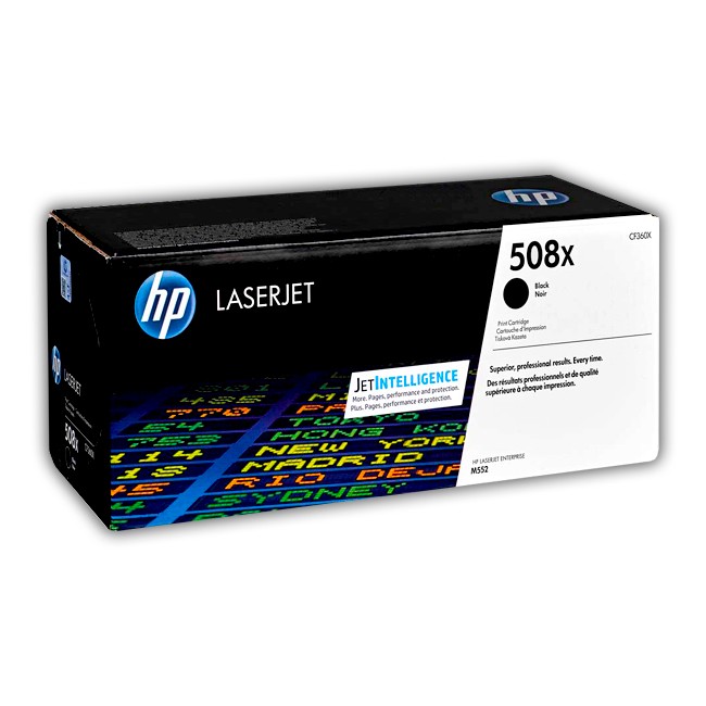 Cartucho de Toner HP 508X original de color negro con rendimiento de 12.500 páginas de impresión.