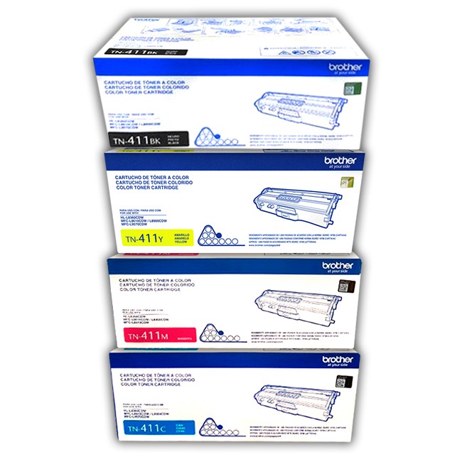Toner Brother TN-411 Pack Original con rendimiento de 3,000 páginas en negro y 1,800 páginas en color.